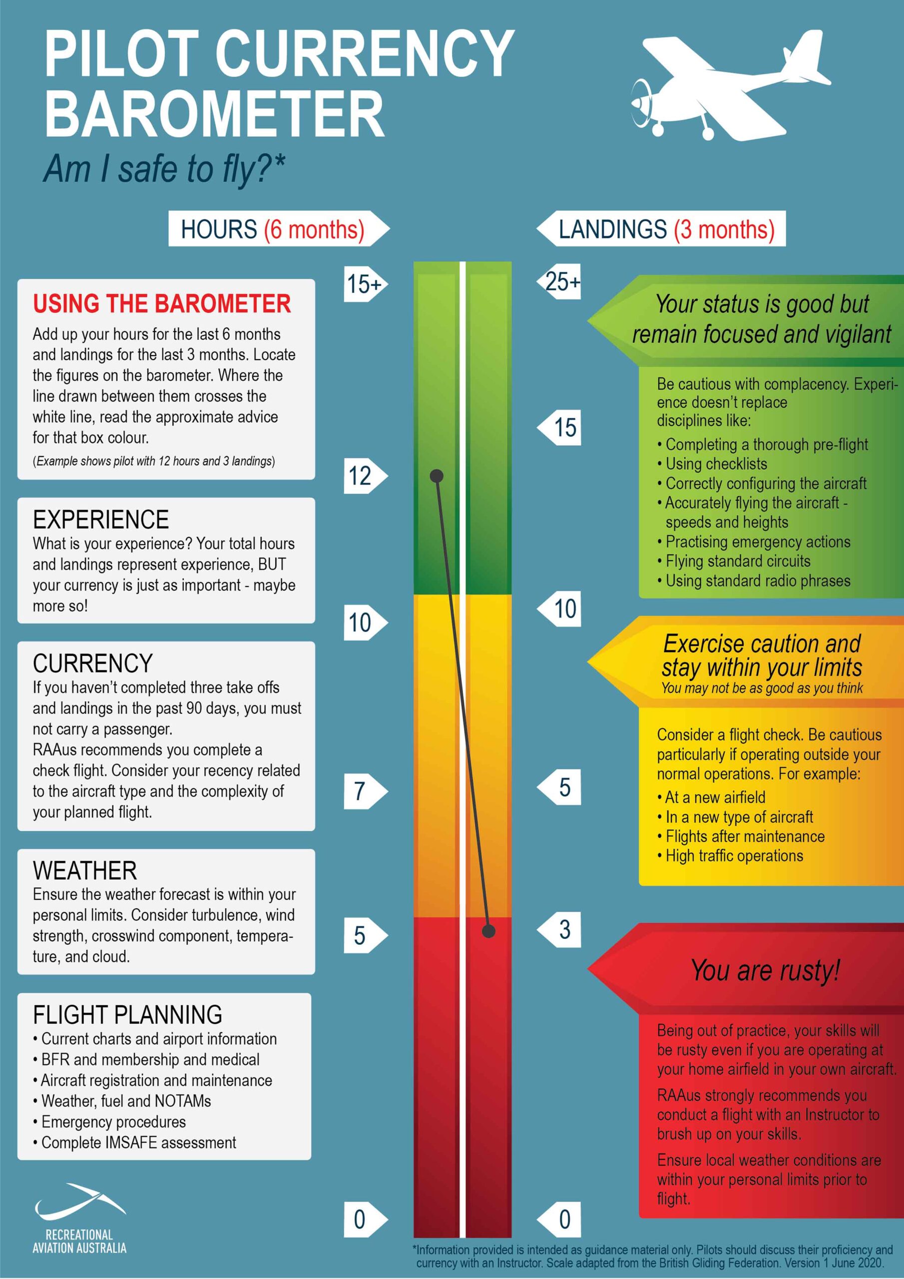 The RAAus currency barometer has been created as general guidance material only – Pilots should discuss their proficiency and currency with with an instructor.